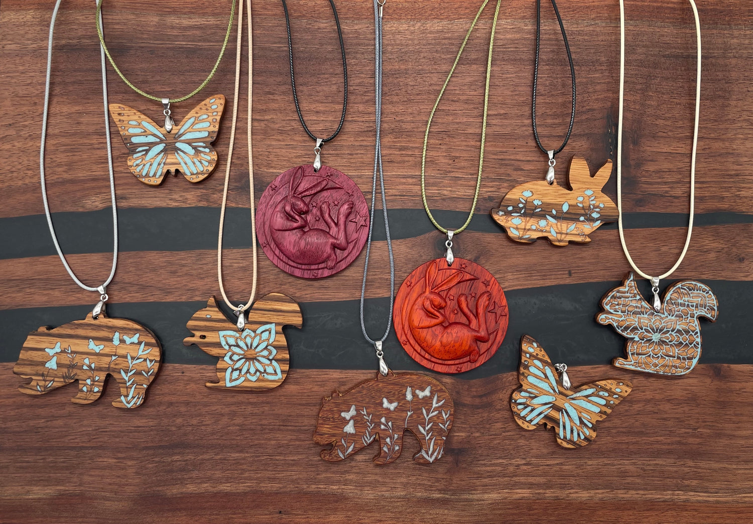 All solid hardwoods hand crafted into whimsical pendents and accessories. You will...