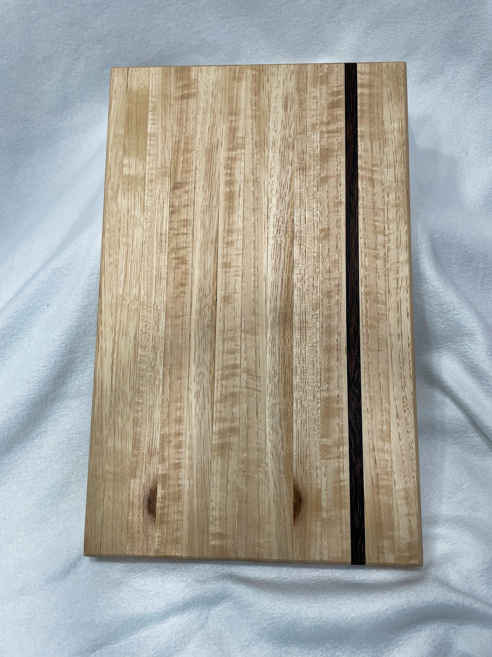 A minimalistic design that will make a bold statement on any countertop. This board is crafted from solid Hickory laminated together to form an edge grain working surface. The creamy Hickory is enhanced with a striking strip of Wenge, which runs from top to bottom.