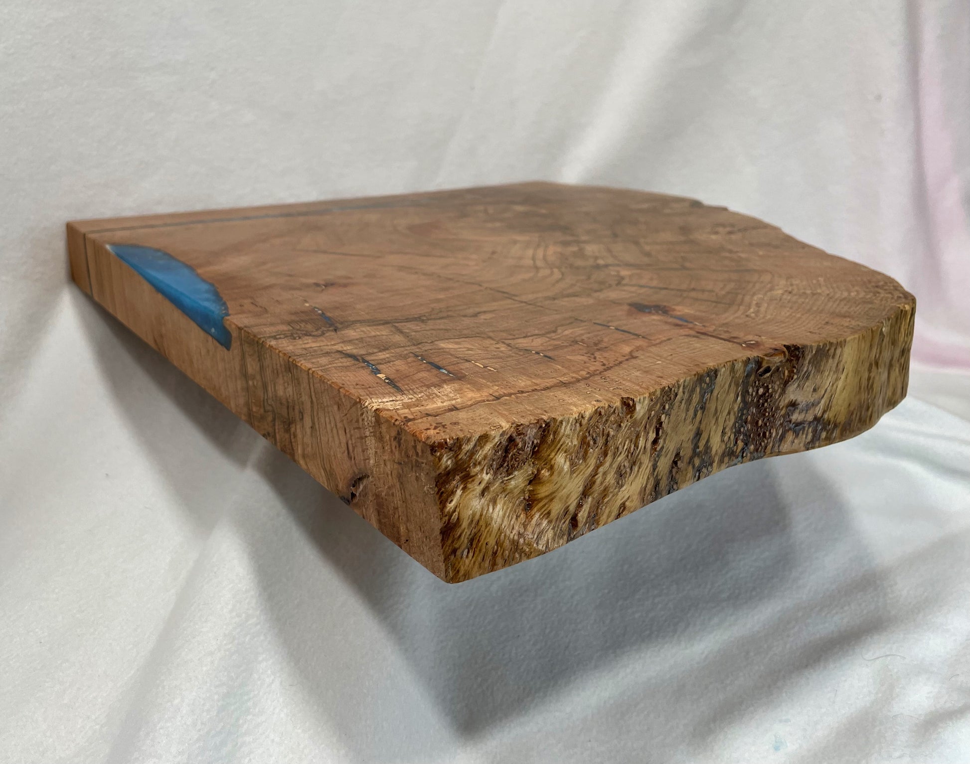 Two sides of this board are cut clean forming a square back, while the remainder is left live edge. Pacific blue mica resin fills all the checks and cracks of the piece, providing not only stability but lending a treat for the eyes. This board is finished with multiple coats of food grade oil and beeswax. Progressively buffed down to form a satin mirror sheen.