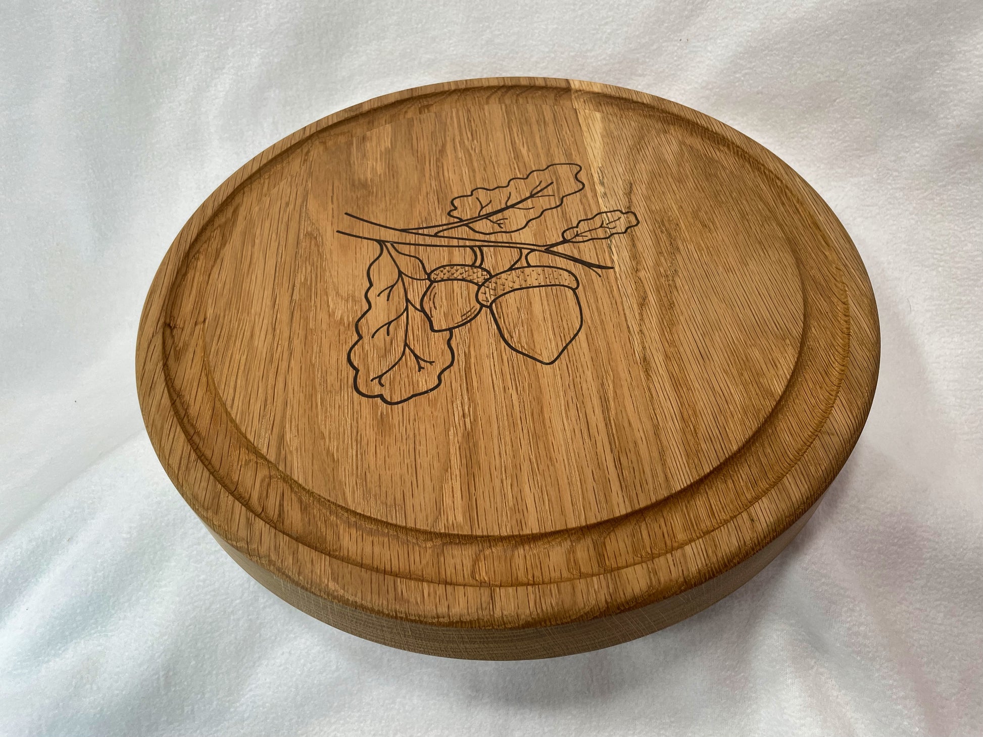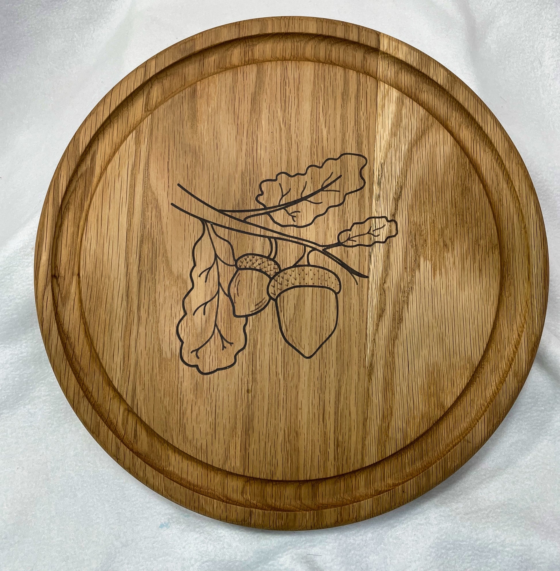 Made from solid white oak the tray side features three equal segments to hold whatever munchies your heart desires. Flip it over (empty the trays of course) and it becomes a hefty charcuterie board. A shallow juice ring encompasses a onyx mica inlay of an acorn.