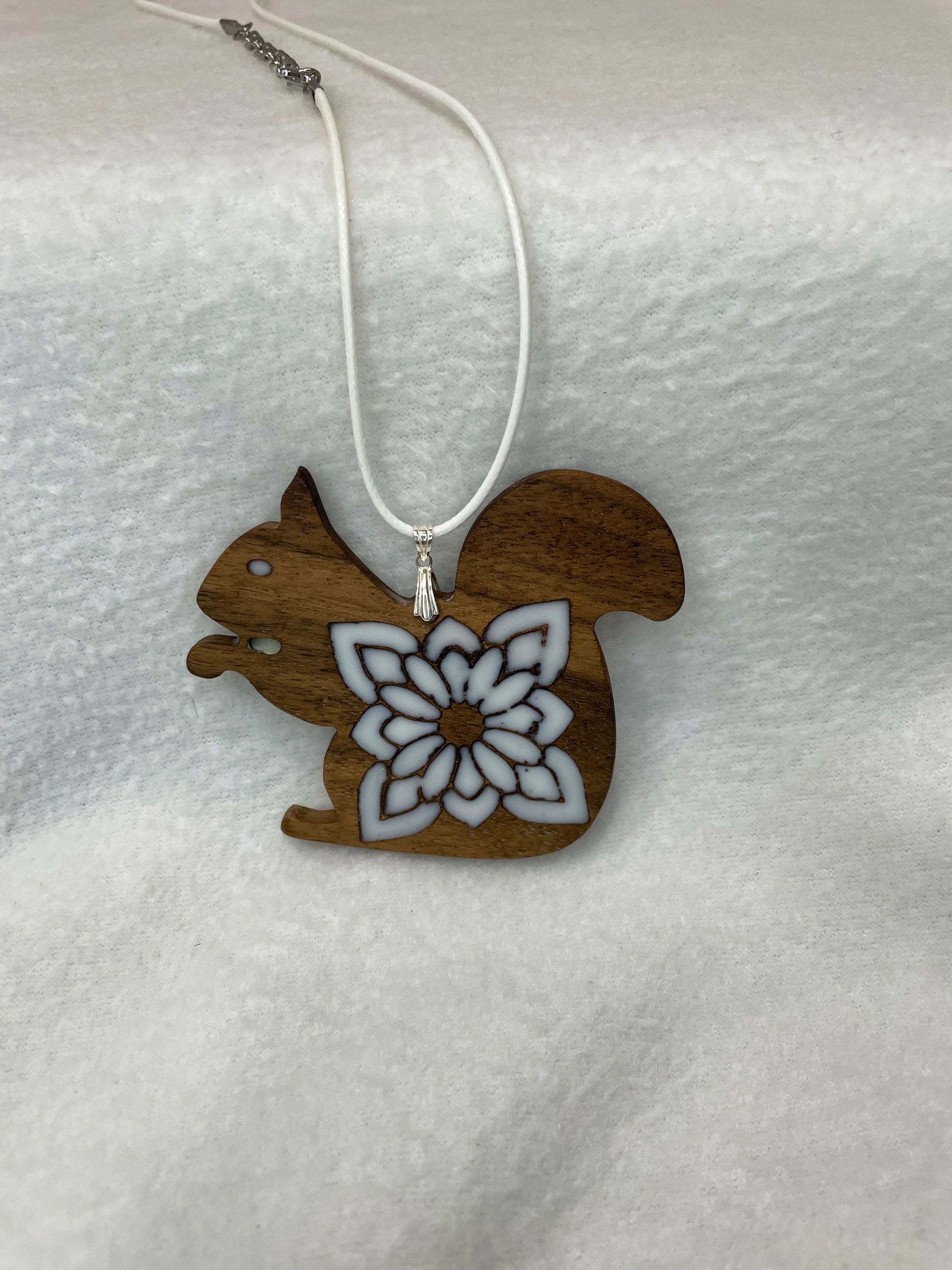 Crafted from solid wood, each squirrel pendant is carved then filled with a white pearl resin. Each piece is hand sanded and buffed with beeswax to bring out the woods luster. Fitted with a silver toned ball clasp and waxed cord necklace.