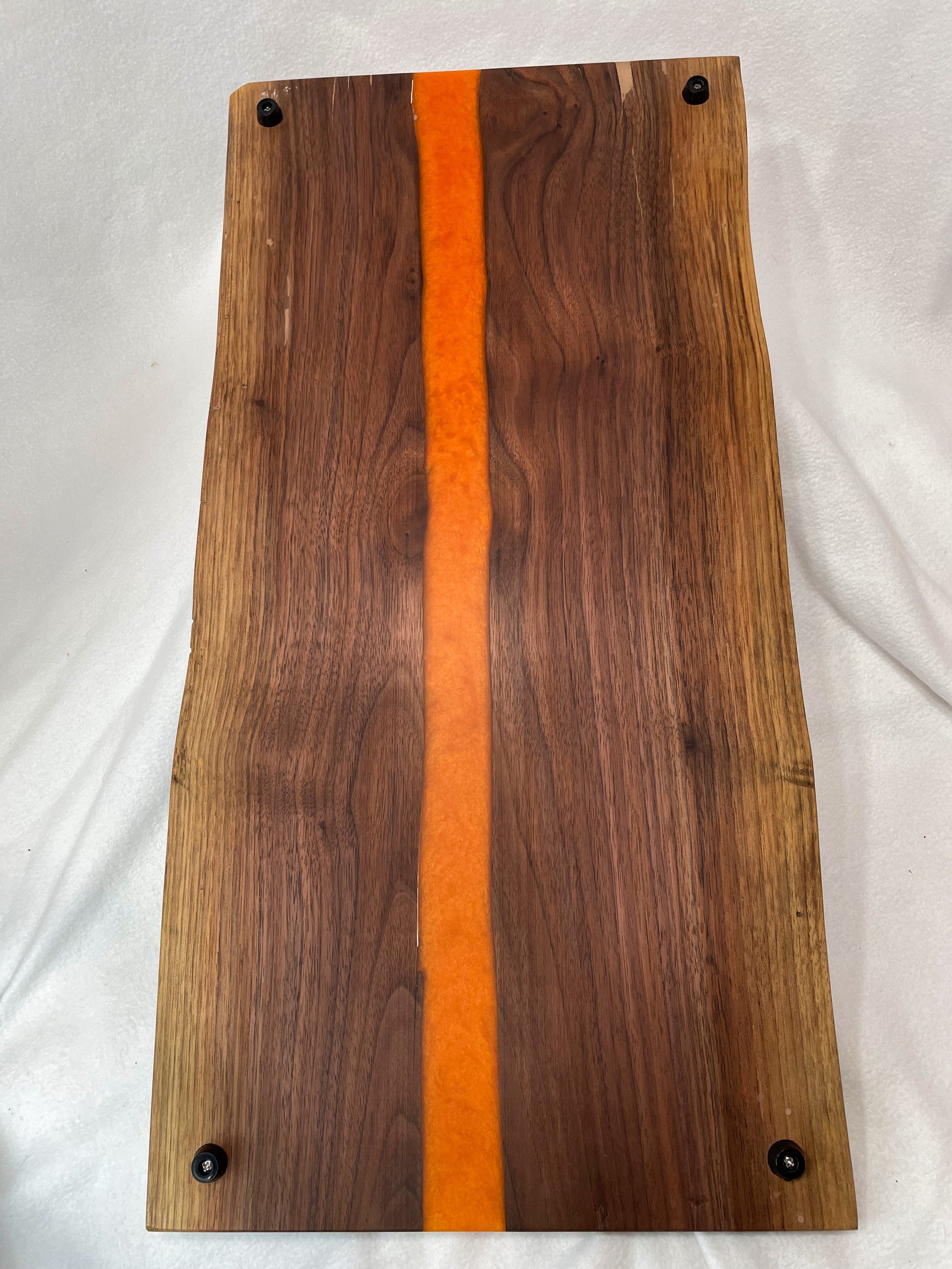 Following a natural split in the wood, we separated this solid plank and poured a river of brilliant orange mica resin. Being barn recovered wood there are some interesting beetle marks in the sapwood which have been filled with an ebony epoxy to really accentuate them.
