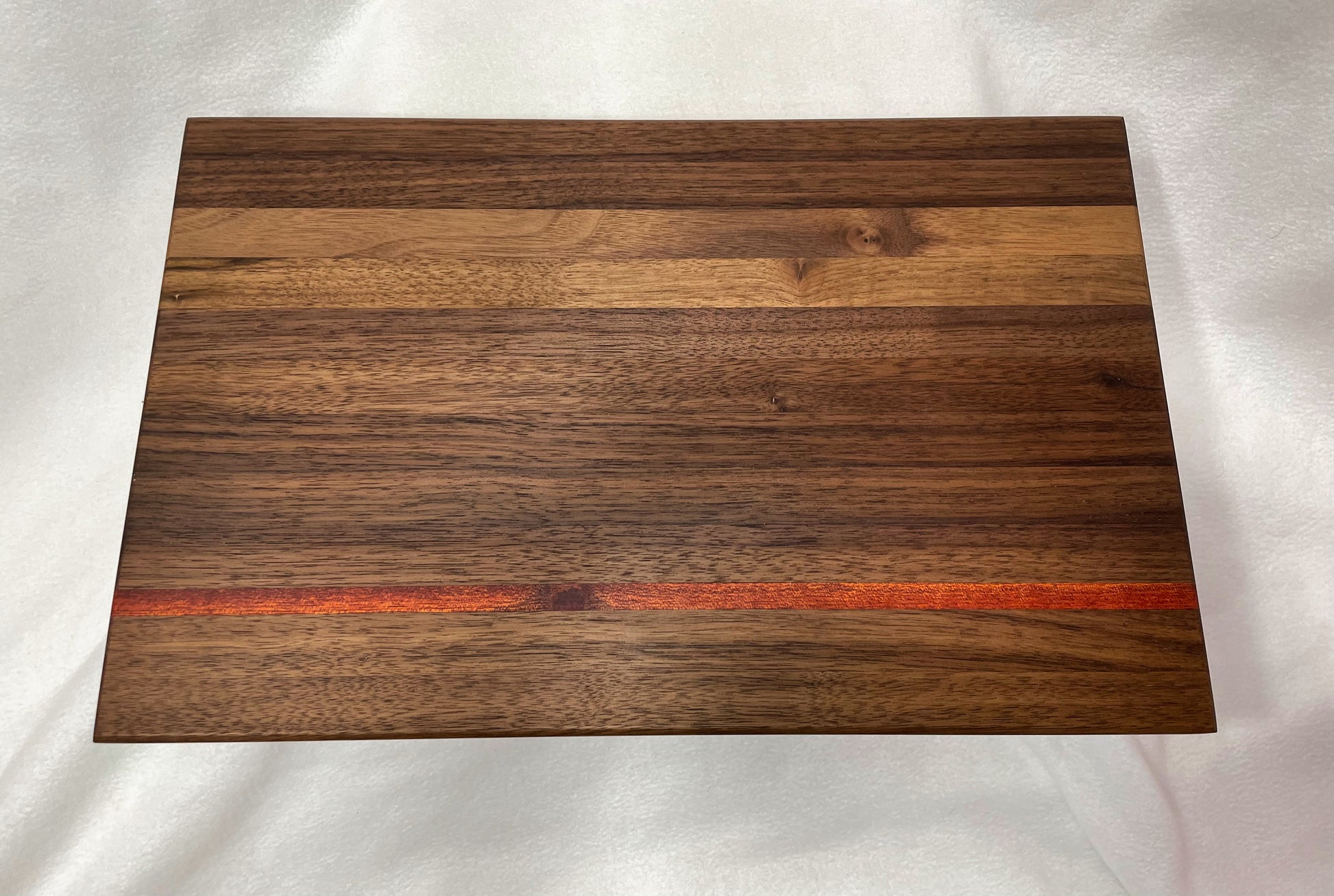 A minimalistic design that will make a bold statement on any countertop. This board is crafted from solid Walnut laminated together to form an edge grain working surface. The luxurious field of Walnut is enhanced with a striking strip of Bloodwood, which runs from top to bottom.